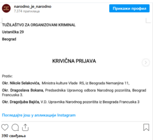 Prema navodima tog portala, informacija o podnošenju prijave ubrzo se pojavila i na društvenim mrežama. Dramaturg Željko Hubač i pozorišna rediteljka Tanja Mandić Rigonat na Fejsbuku su podelili fotografiju dela tužbe, na kojoj se vidi protiv koga je prijava podneta i kome je upućena. Objavu je prenela i Dramska scena Narodnog pozorišta, čiji je ansambl na Instagramu objavio sadržaj prijave, čime je vest postala dostupna široj javnosti.